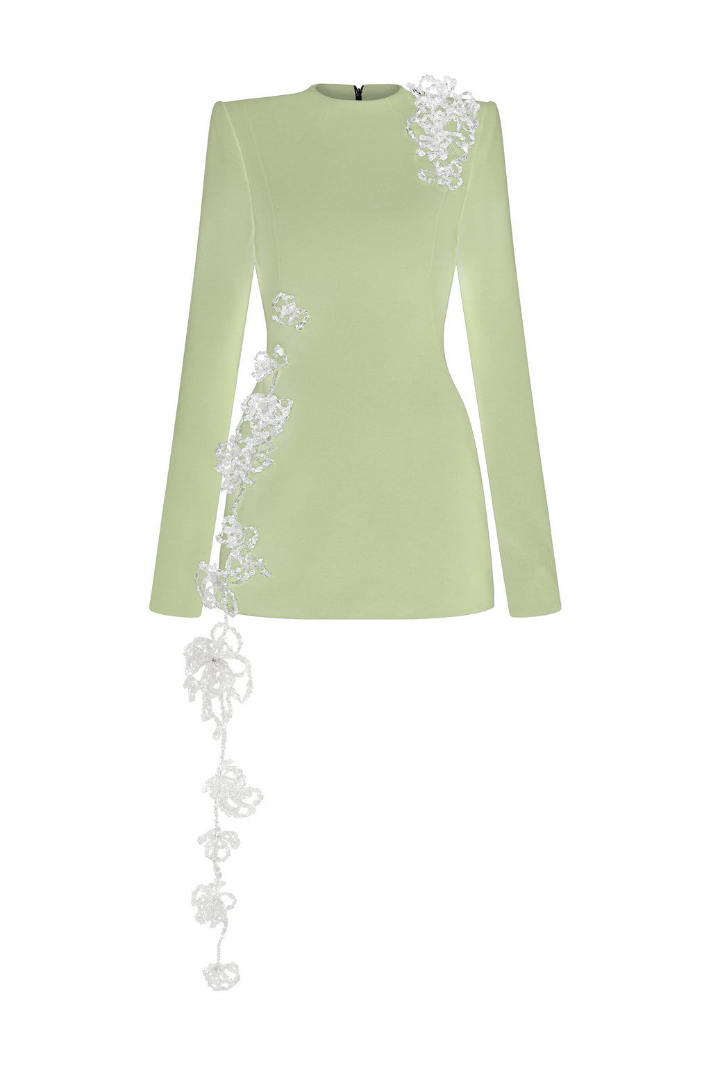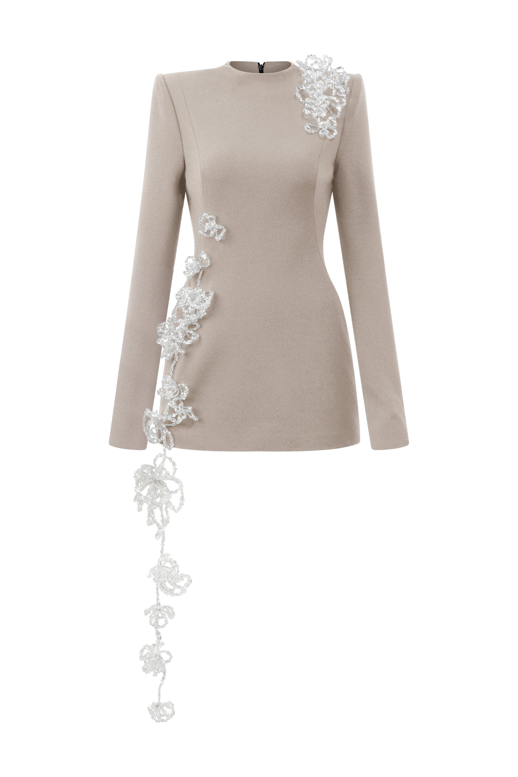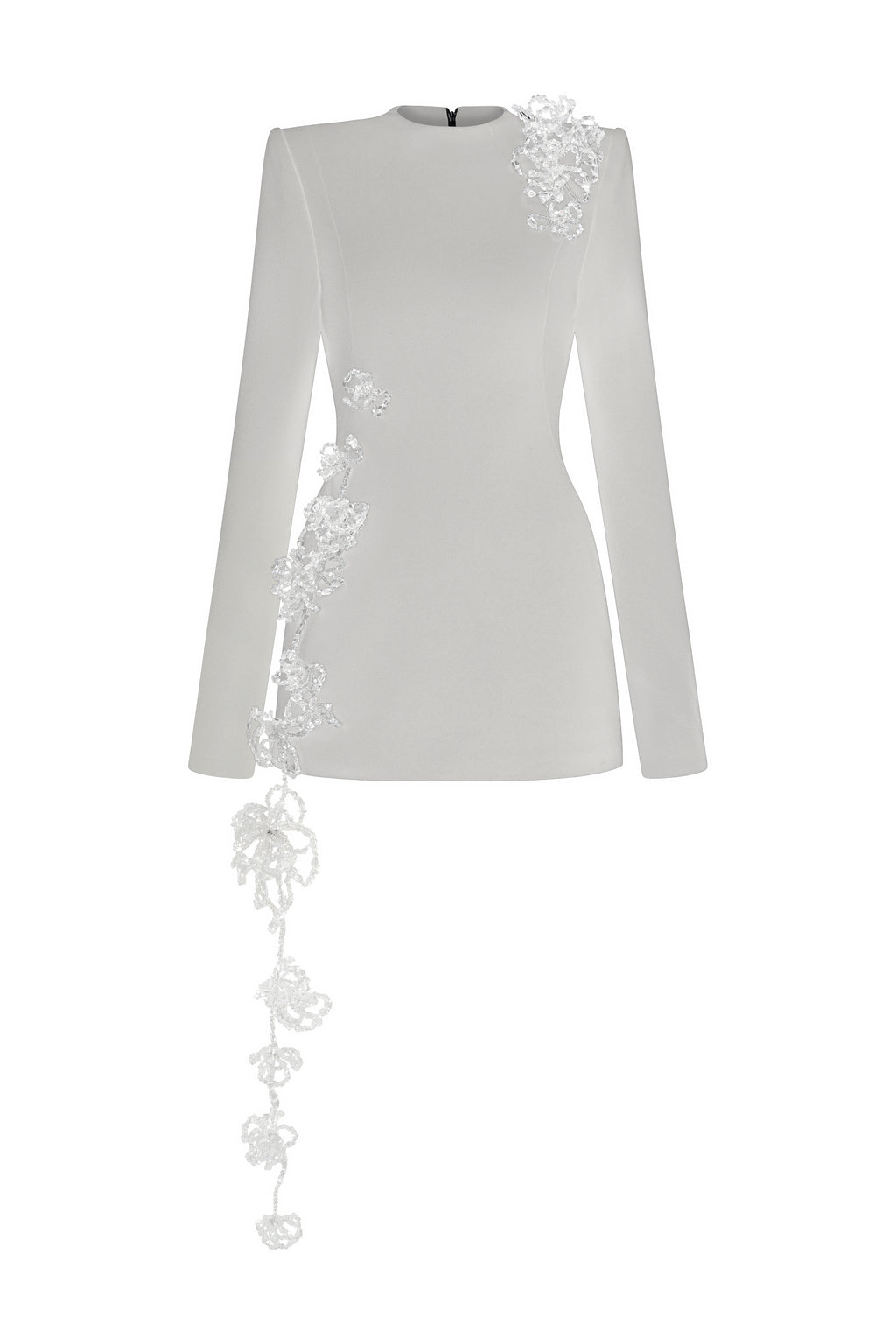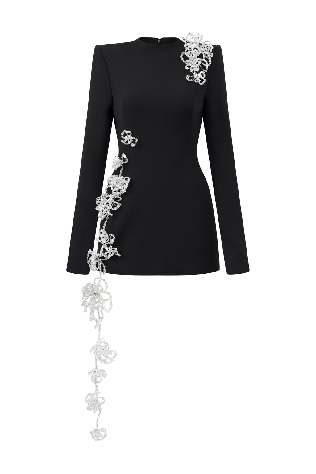 Form-fitting long-sleeve mini dress in poly crepe. Handcrafted 3D crystal floral embellishments run along the body, adding a touch of refined allure.