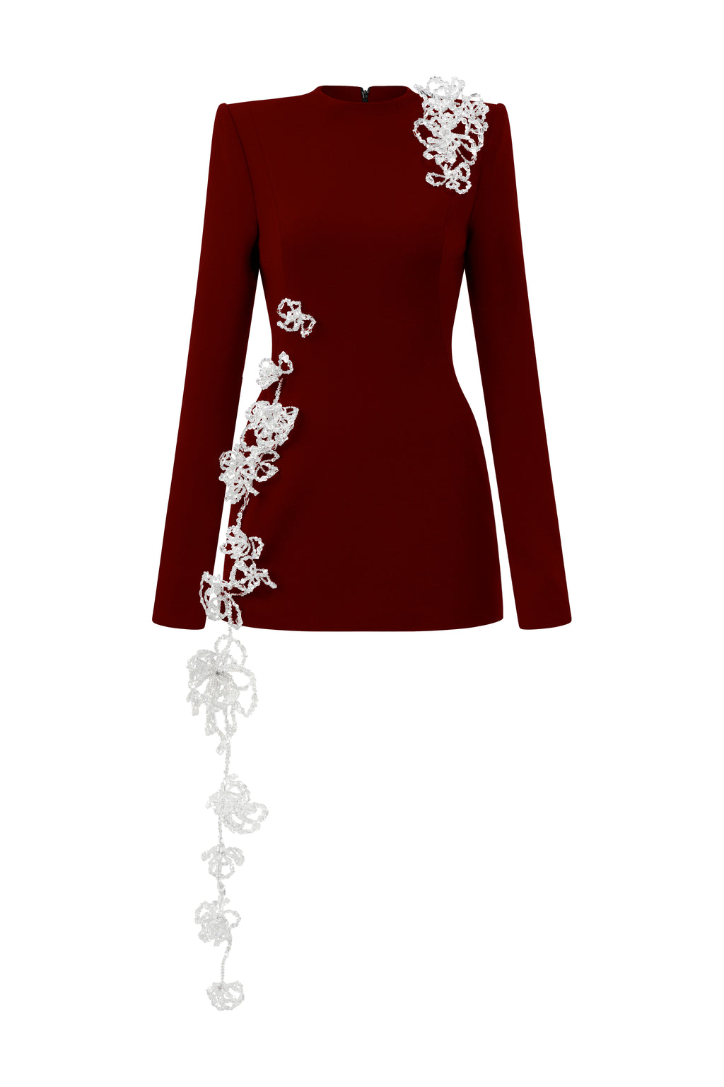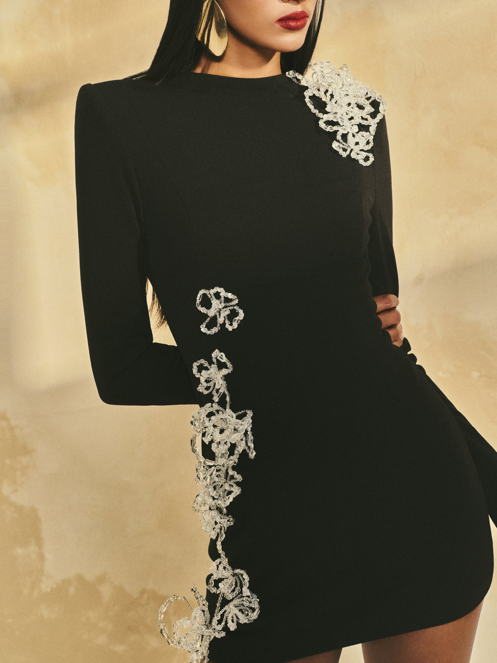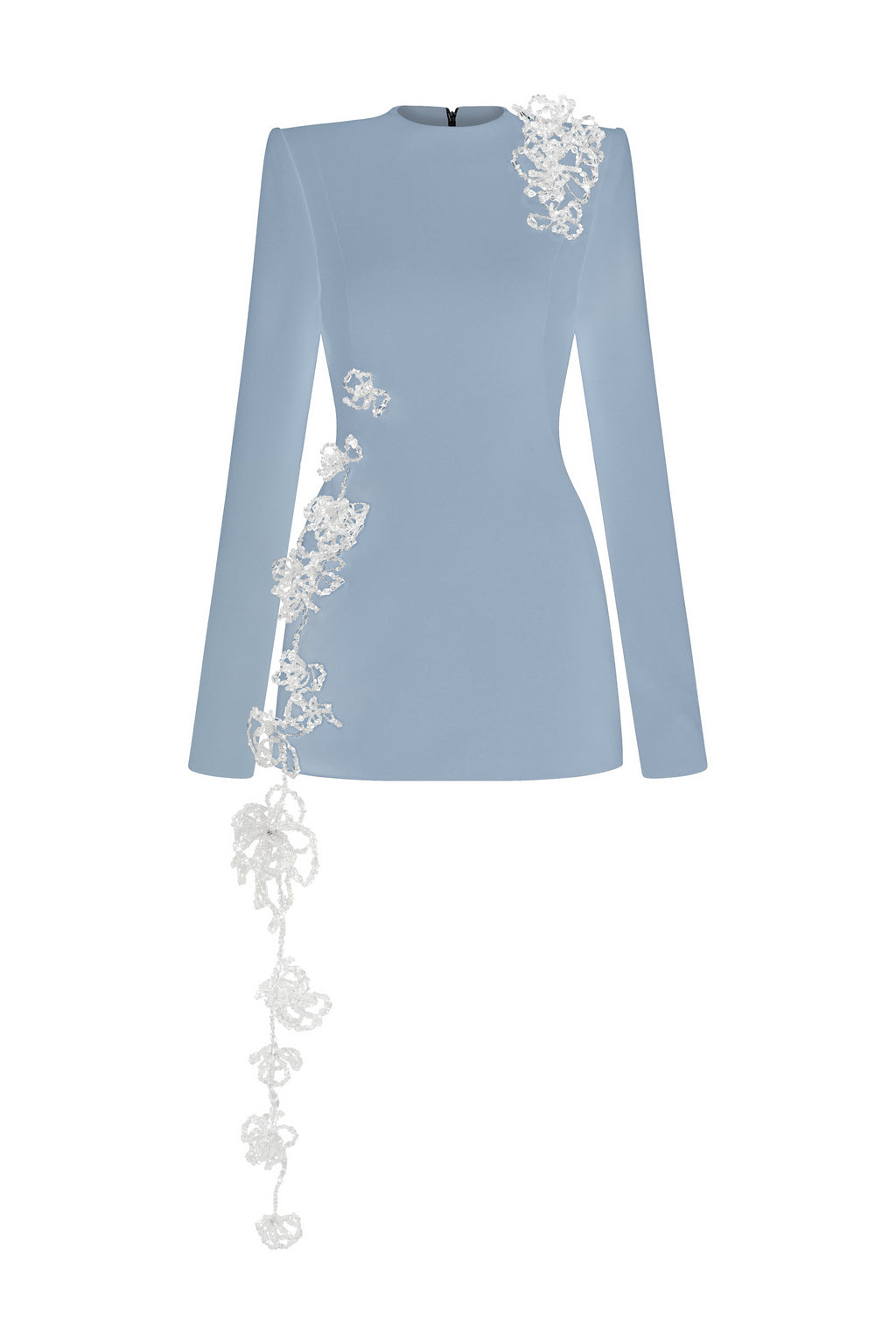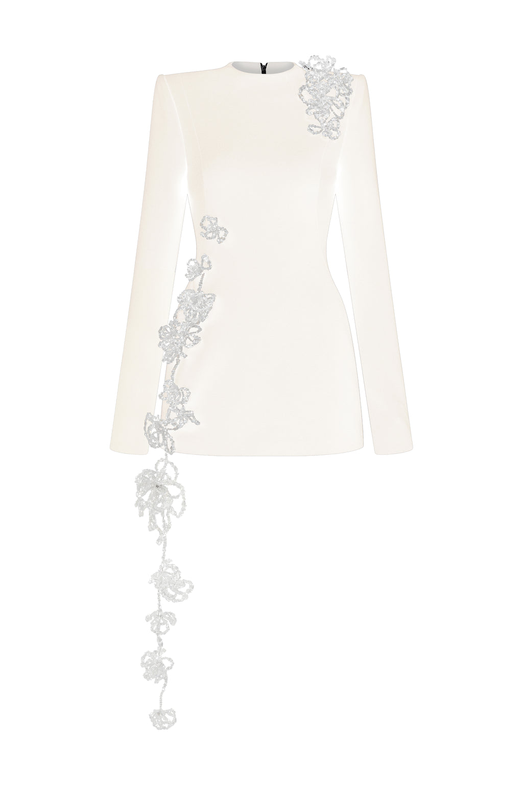 Form-fitting long-sleeve mini dress in poly crepe. Handcrafted 3D crystal floral embellishments run along the body, adding a touch of refined allure.