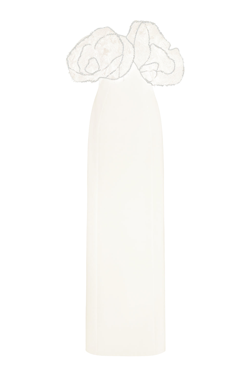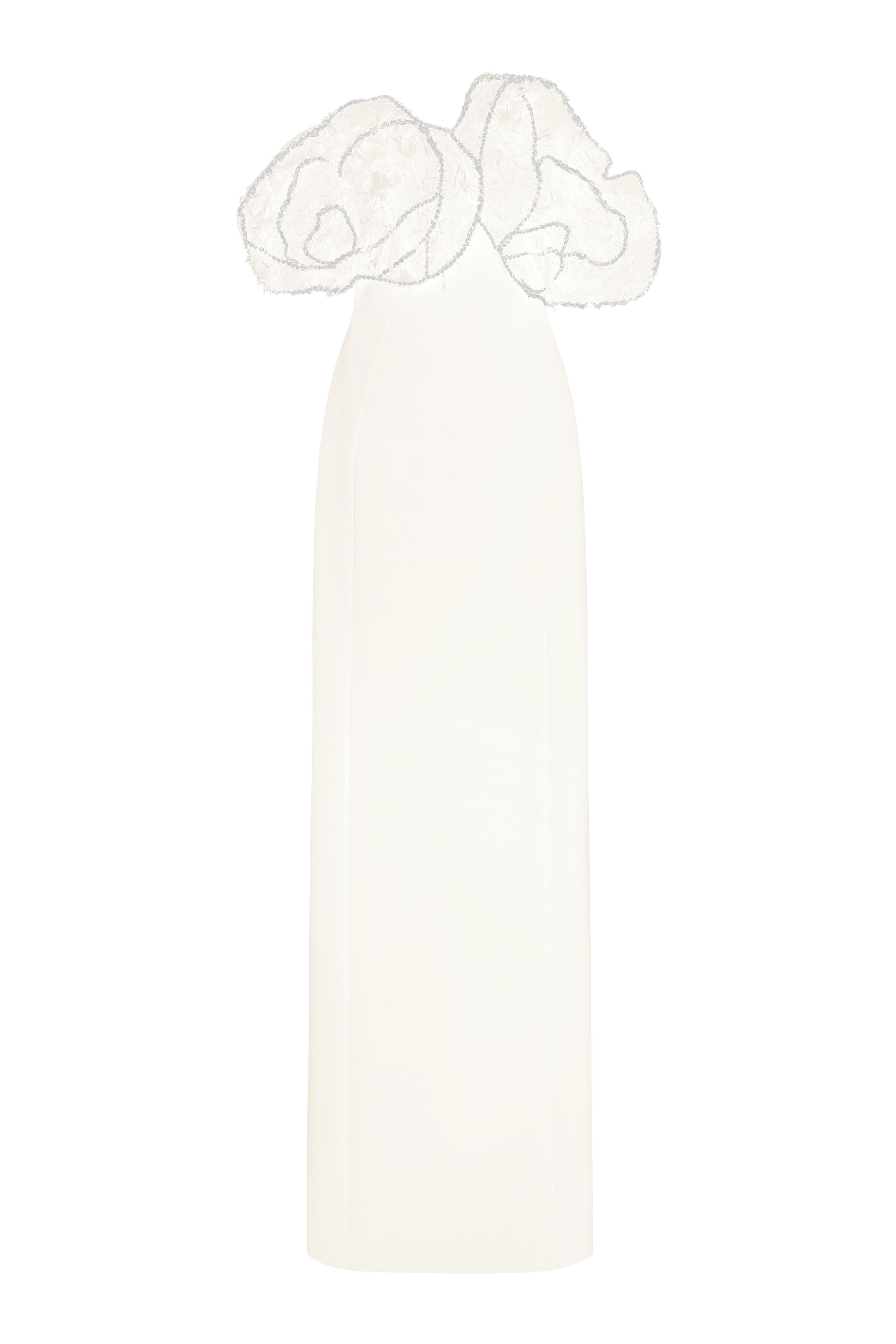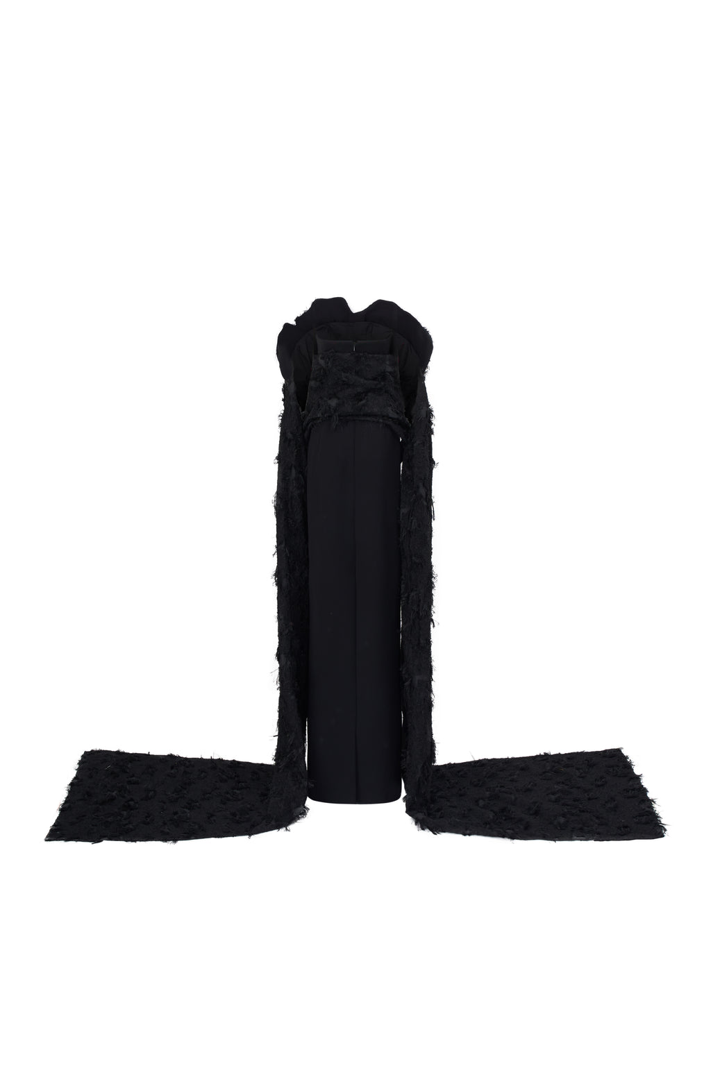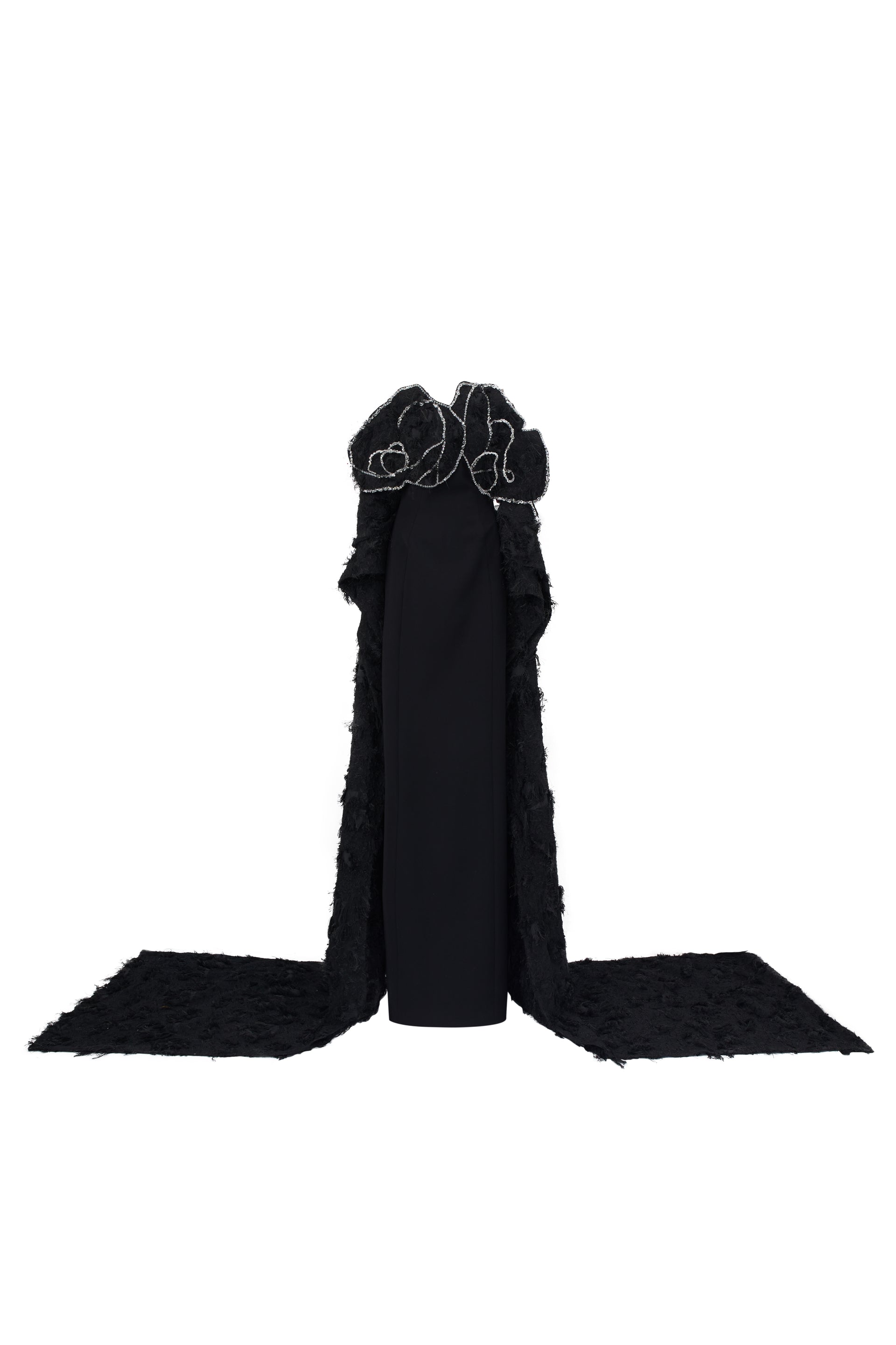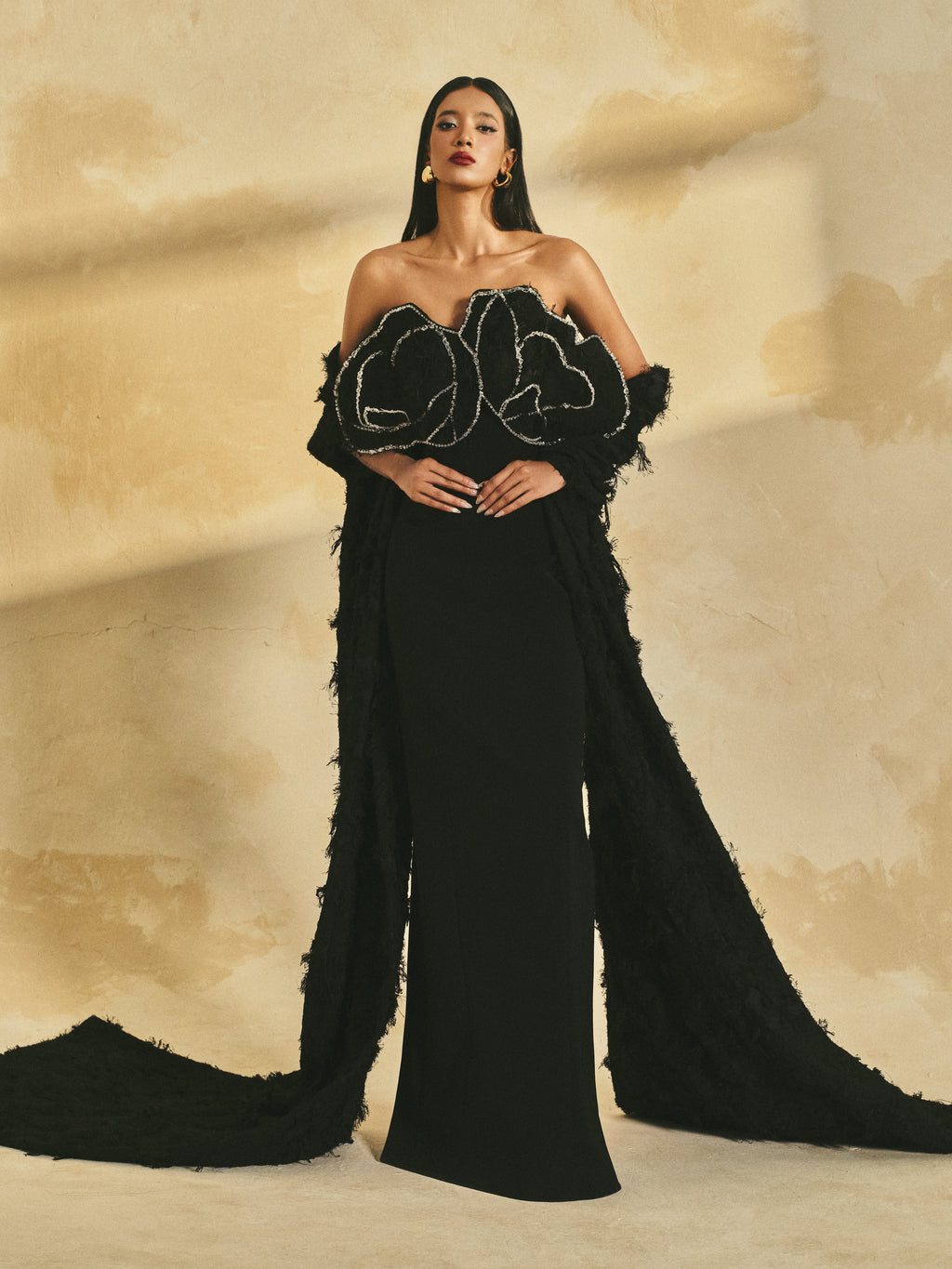 Off-shoulder maxi dress crafted from poly crepe, paired with a floor-sweeping scarf in fringe jacquard. Handcrafted 3D floral motifs embellished with crystal beads add a touch of artisanal elegance.