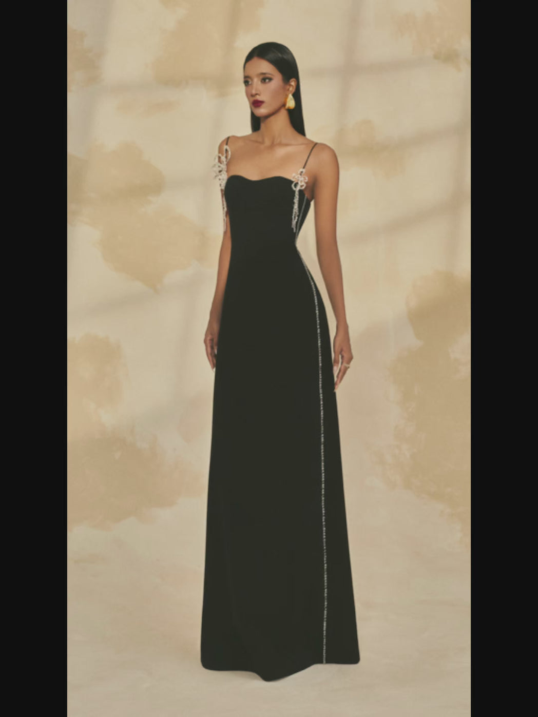 Maxi dress with delicate shoulder straps, crafted from poly crepe and featuring a softly contoured neckline. The bust is adorned with handcrafted 3D crystal floral embellishments, adding a touch of refined elegance.