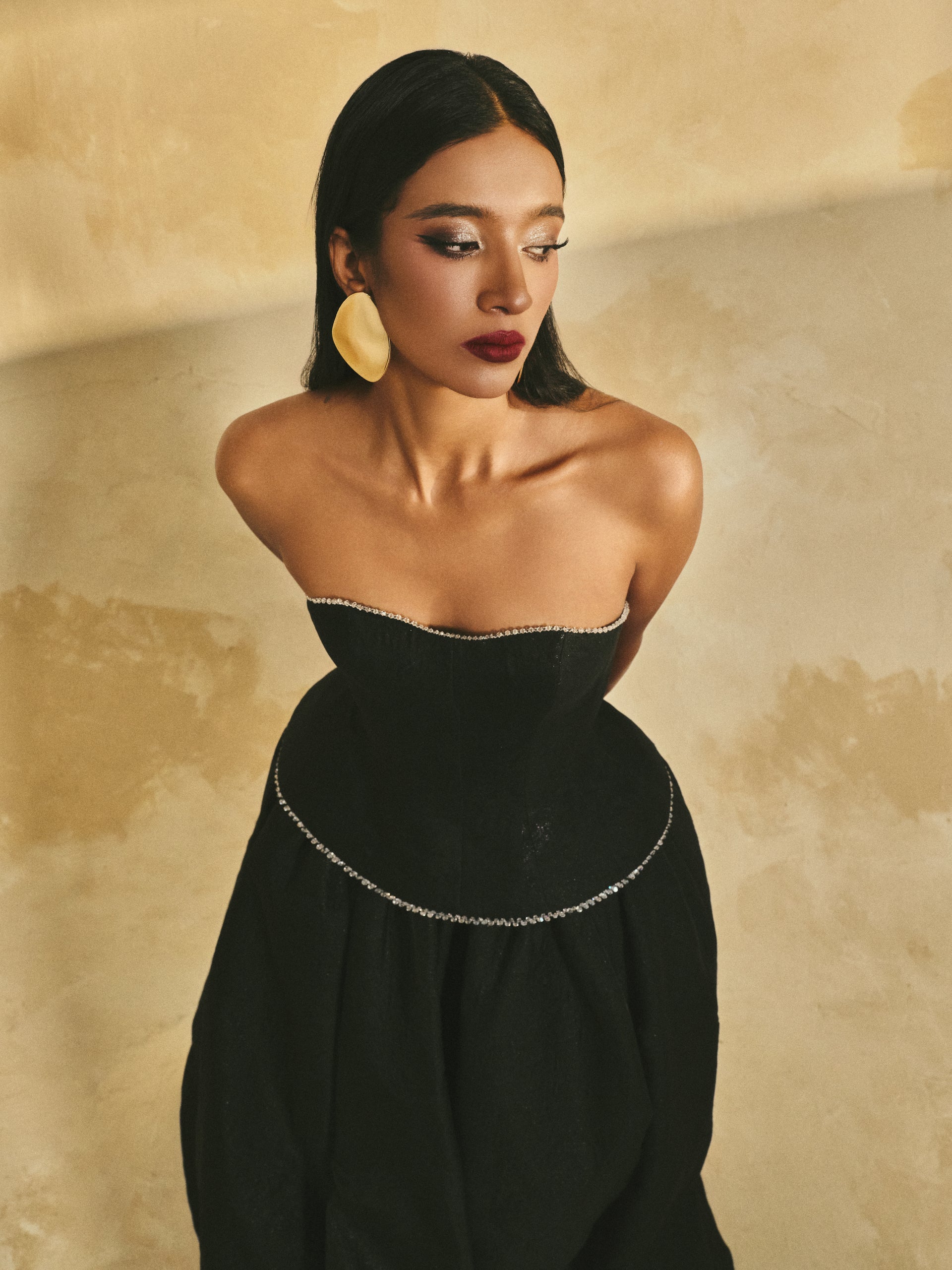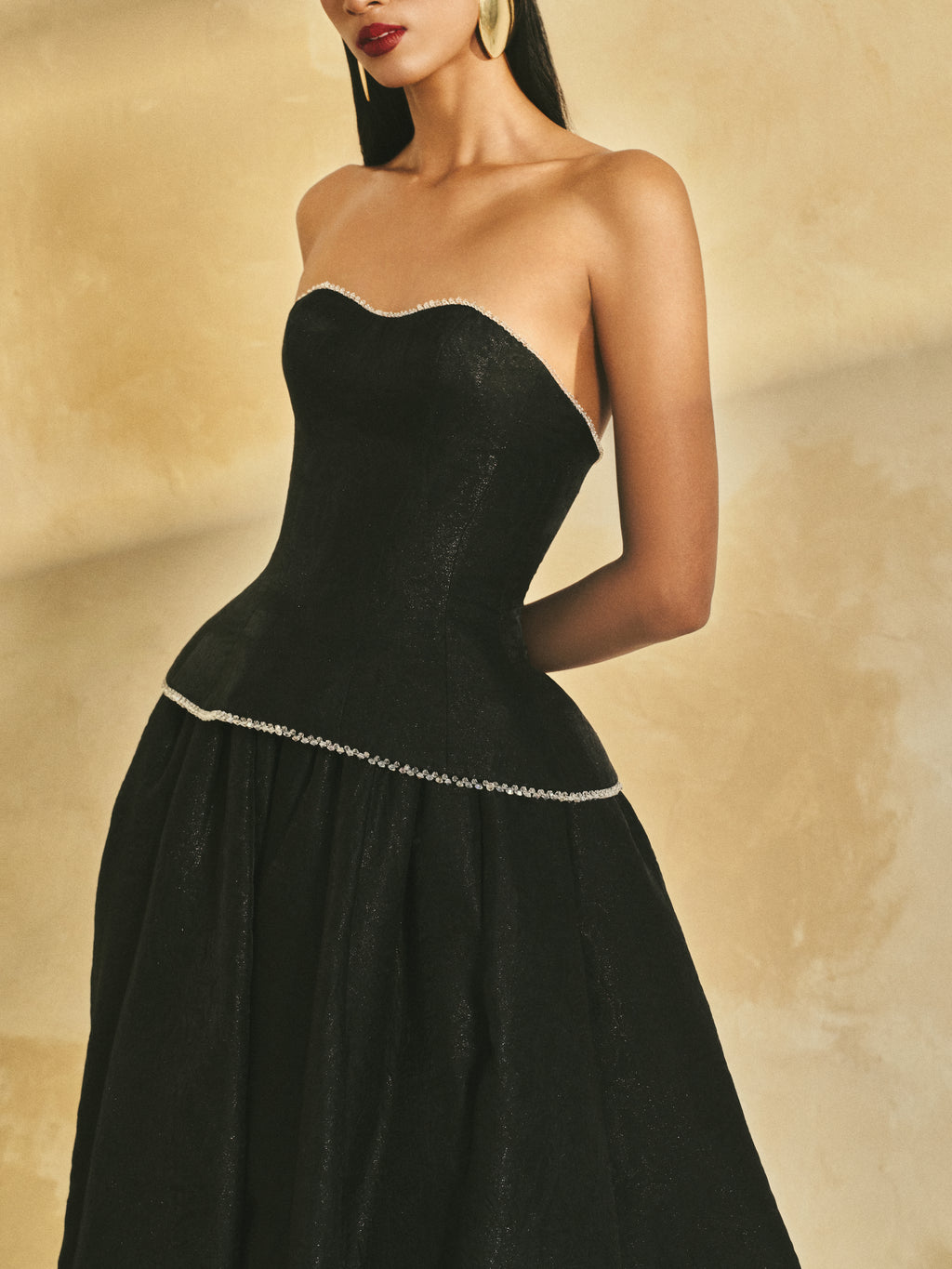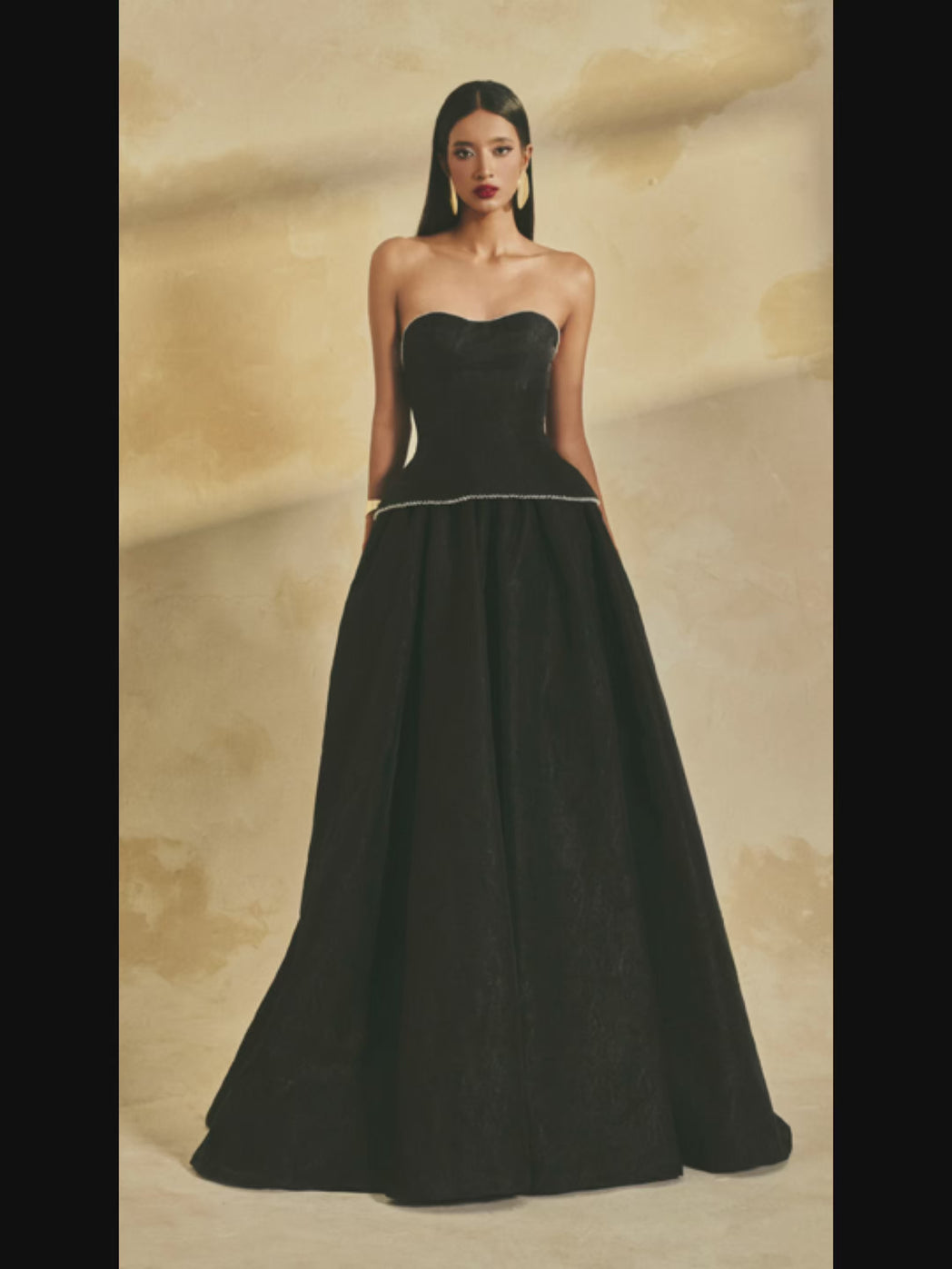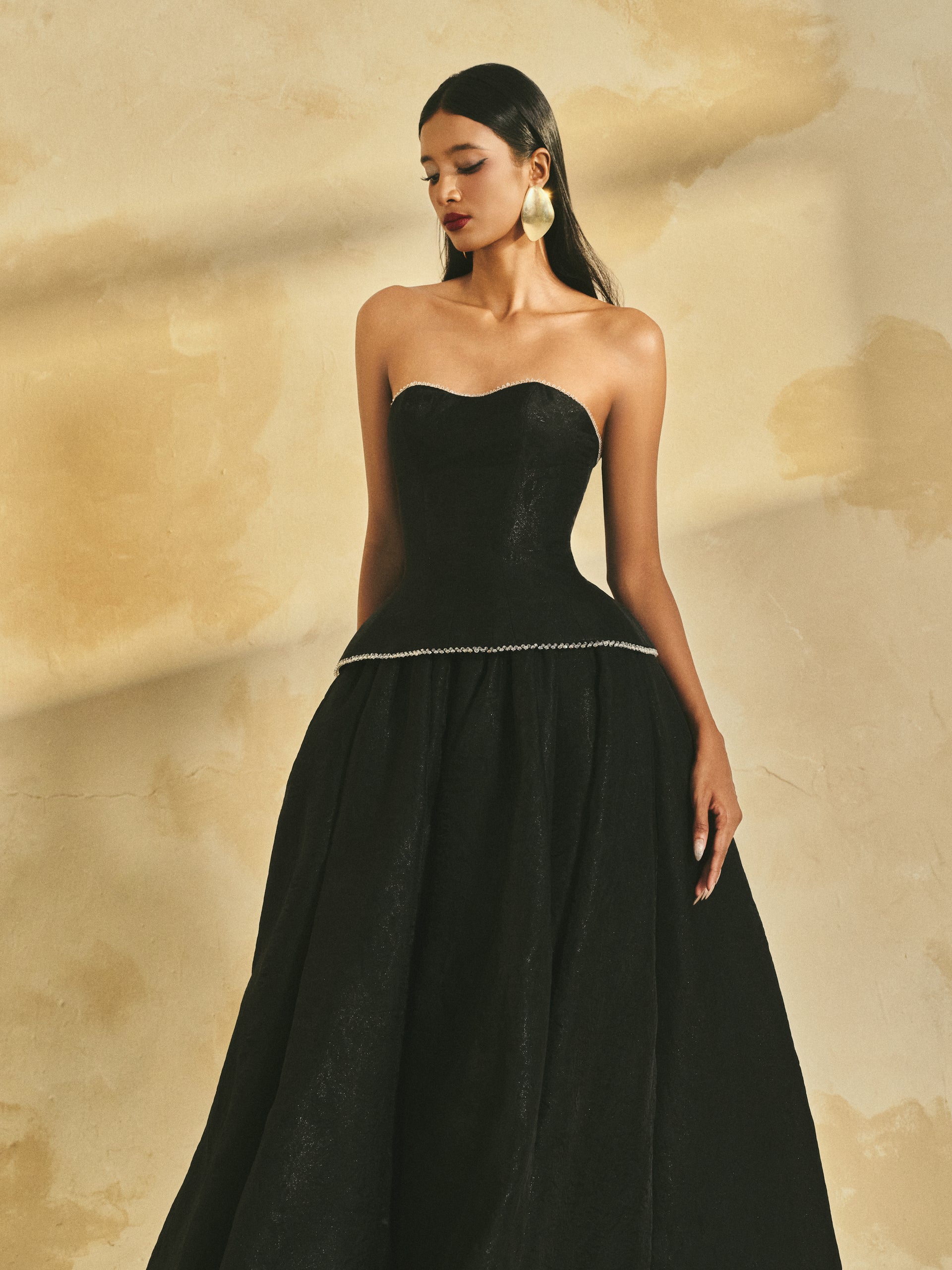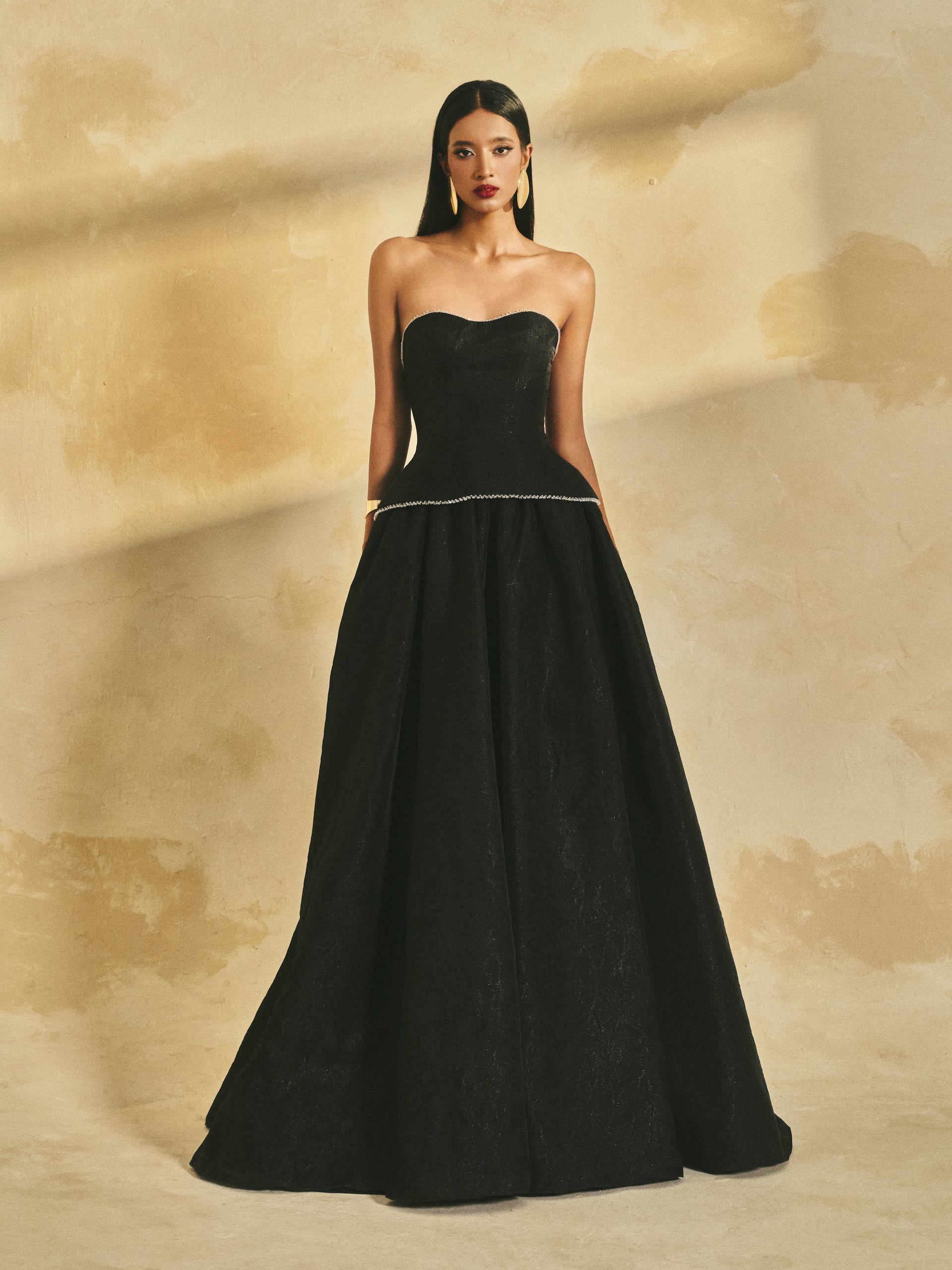 Off-shoulder flared gown featuring a softly contoured neckline. Crystal beading accents the neckline and peplum hem, adding a touch of graceful shimmer.